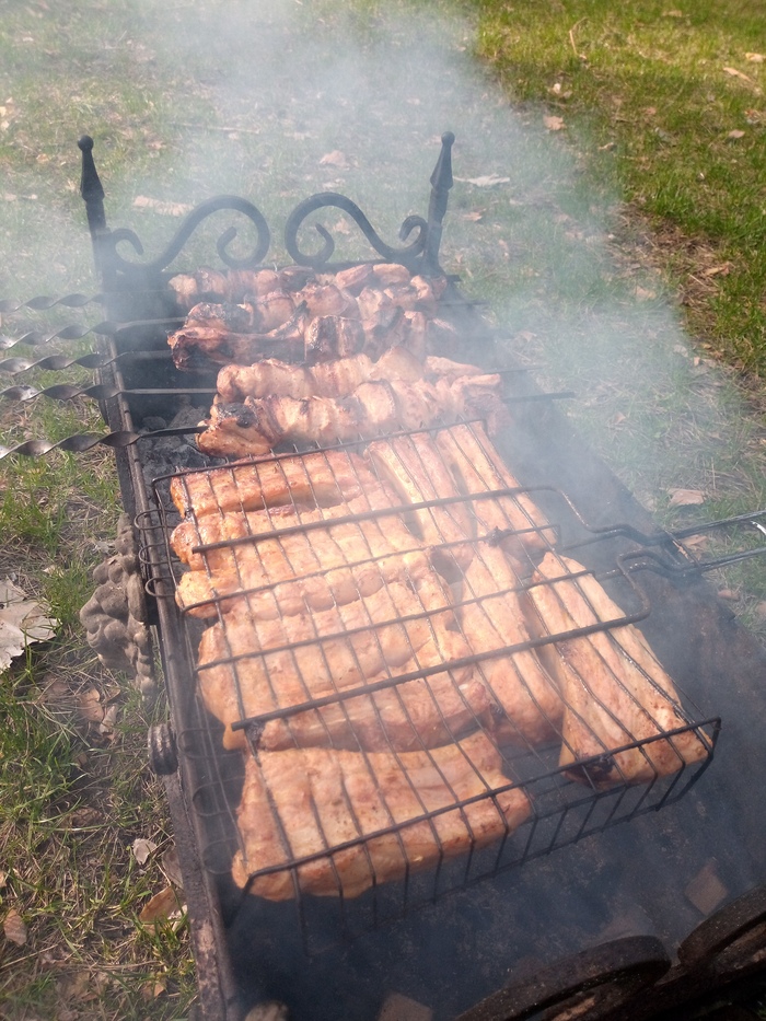 расход угля минимальный по сравнению с мангалом, мясо получается жарено-копченым, гораздо сочнее чем на мангале, даже фоткать не успевал))