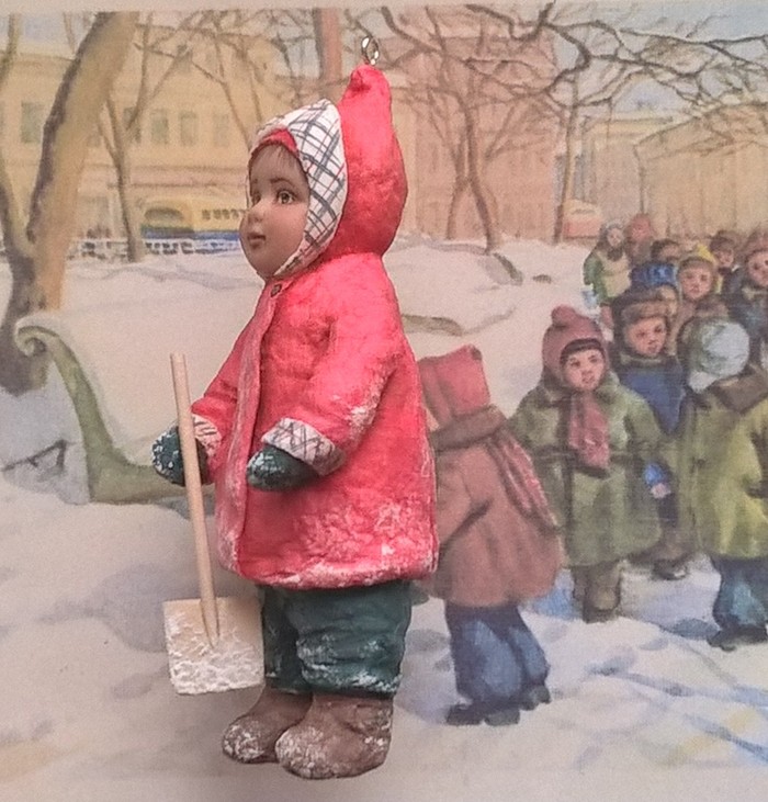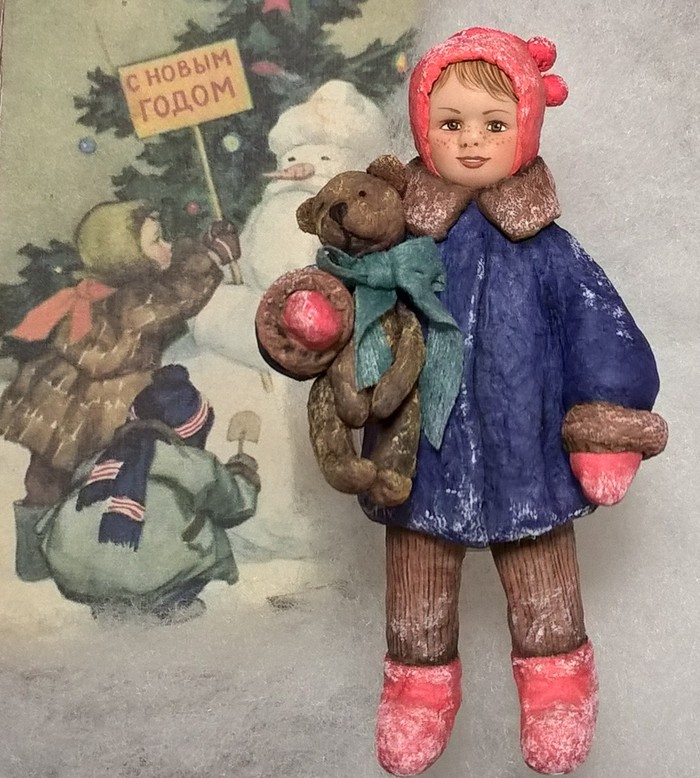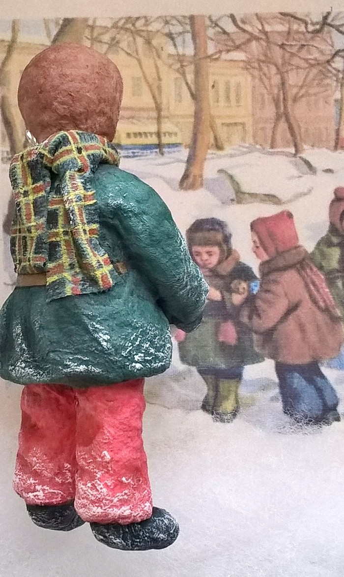 Ёлочные игрушки в технике ватное папье-маше. Выполнены по мотивам старых советских открыток. Вдохновлённая просмотром фотографий, картинок и открыток 50-х, 60-х гг., принялась творить...Вот что получилось в итоге...