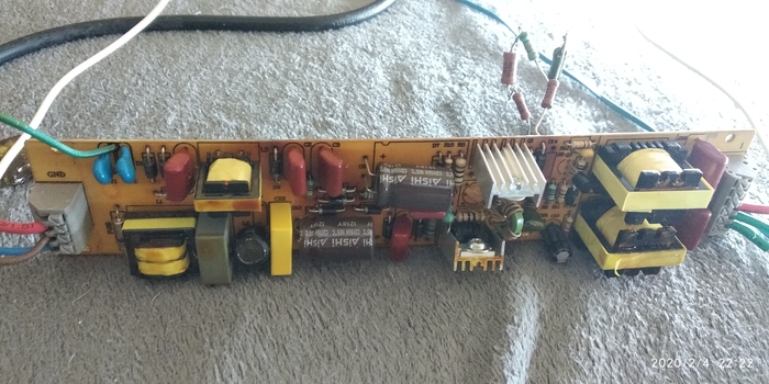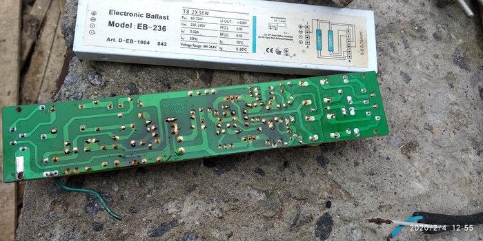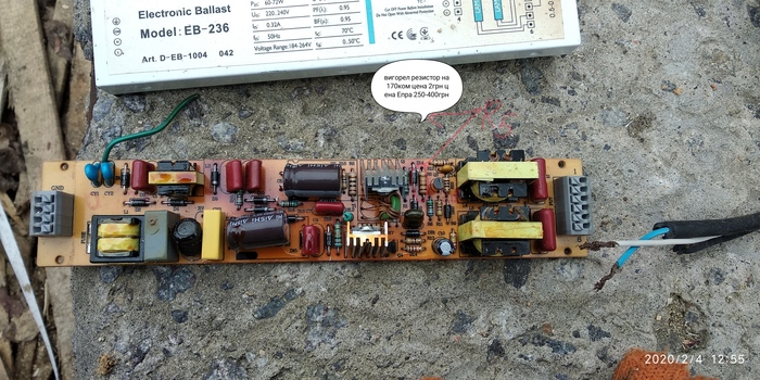 Был на работе и нашел в тырсе епра думал будет рабочий но нет кто выбросит исправный епра.Итак проверив и в итоге понял что неработает но жужжит при включении все целое и предохранитель целый при внешнем осмотре есть места перегрева.в итоге все перепроверив был найден неисправен резистор на 170ком на 3вата.в наличии такого с небыло в помощь последовательное подключение резисторов.В итоге все заработало неплохо так для находки и все нормально работает в течение нескольких часов тестировал и немного греется.Все фото прилагается снизу:-)