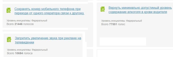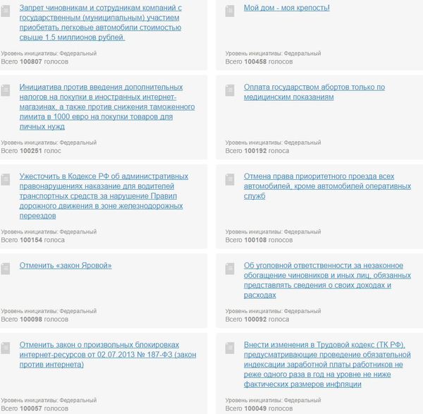 Но они не набрали нужного количества голосов, а скорее просто появились в нужное время, в тоже время инициативы набравшие 100 000 голосов, а их аж целых 13 штук, не воплотились в законопроекты:
