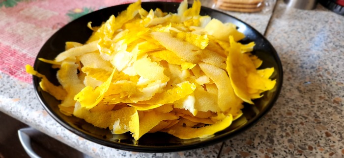 Сначала берём лимоны, моем их тщательно и аккуратно снимаем цедру, стараясь не снять белую часть кожуры (оптимально это делать картофелечисткой).