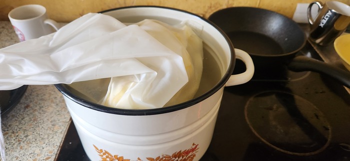Сами половинки лимонов кладём в лавсановый мешок и кидаем в сироп. (Лавсановый мешок нужен, чтобы мякоть лимона не заполонила сироп. Чем плотнее мешок, тем лучше. Так надо, карочь). Особо много кипятить не рекомендую. Довели до пузырьков - выключили нагрев. Дали настоятся.