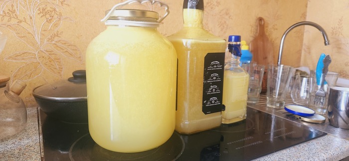 Потом мы настоявшуюся смесь фильтруем (сито, марля и т.д.). На выходе у меня получилось чуть меньше 2,5 литров настоявшейся облепиховки. Теперь нам её нужно разбавить, чтобы друзья и подруги не офигели от крепости. В этот раз я решил поэксперементировать и разделил настойку на две части - одну решил соединить со свежевыжатым апельсиновым соком, вторую разбавить по-классике сиропчиком.