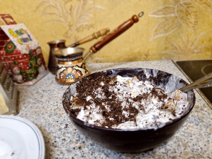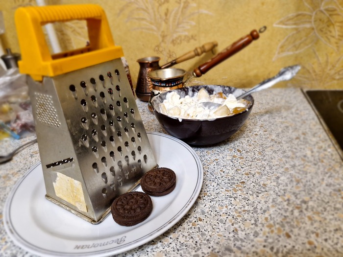 И, наконец, берём печенье-какао . Его мы натираем на крупной тёрке.