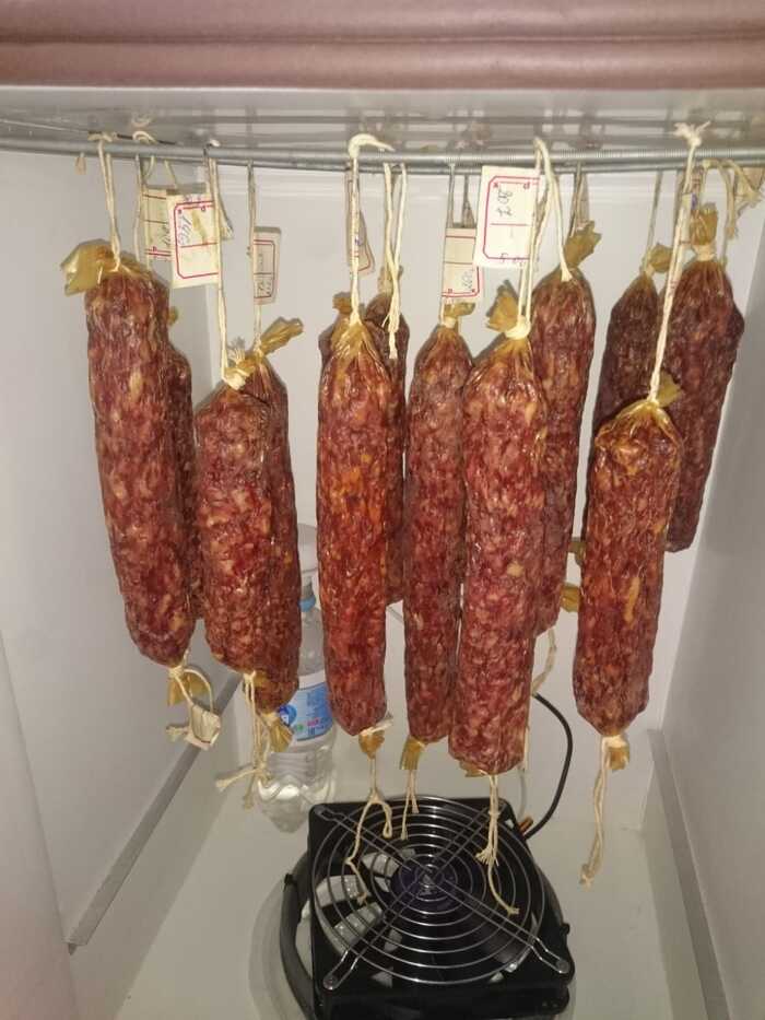 Сделал холодильник для сырокопченой колбасы из кулера для воды. Там стоит компрессор как в обычном холодильнике. Бывают кулеры с элементами Пельтье. Холодильник получился маленький, не хватает места, но со своими задачами справляется. Влазит примерно 6-7 кг. Колбаса сохнет от полутора месяцев и более.