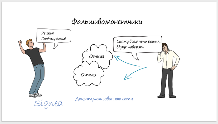 Можно ли подделать записи о переводе или создании денег? Начнем с создания криптовалюты. Если вы нашли число, удовлетворяющее условиям задачи, то деньги ваши. Если не нашли, но отправили всем участникам информацию, что вы это сделали, то каждый участник обязан проверить ее, и либо подтвердить, либо опровергнуть. Все операции проверки работают по определенным алгоритмам и делаются без участия человека. Обмануть всех участников сети невозможно. В этом заключается важнейшее свойство децентрализированных сетей, в котором все участники равны между собой.