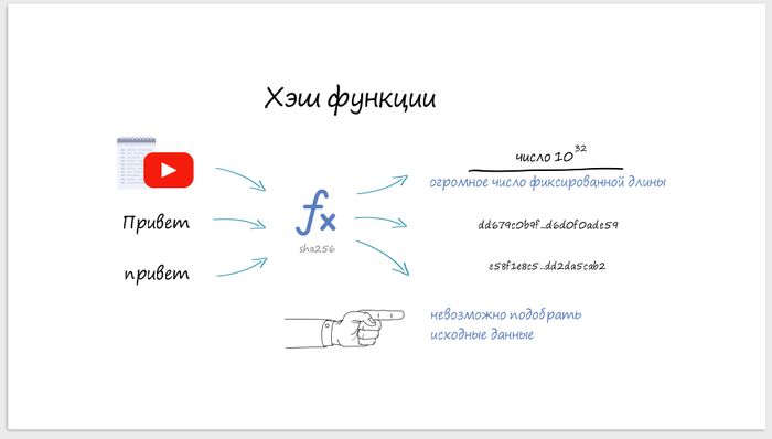 Начать рассказ следует с математической функции, которая лежит в основе любой криптовалюты. Это хэш-функции. Они преобразуют любую информацию в большое число фиксированной длины. Любая информация, будь то число, текст, файл на компьютере, картинка или музыка могут быть преобразованы в число.