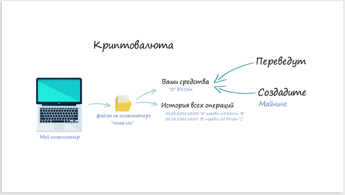 Тот же принцип при переводе денег с кошелька на кошелек. У вас в компьютере имеется документ, в котором сказано, что вам принадлежит определенный объем криптовалюты. Для перевода создается новый документ, в котором указывается, что из вашего файла должно быть перечислено несколько криптомонет в другой кошелек. Эта информация отправляется всем участникам сети. Как только участники подтвердили ее, перевод признается выполненным.