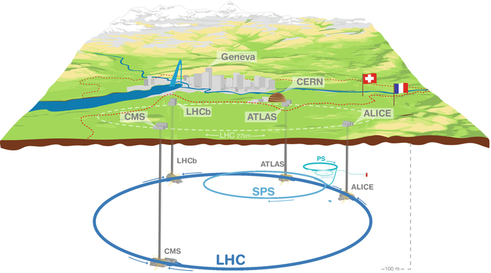 1) Картинка выше изображает стилизованную окружность коллайдера, длина 27км. Приятно, что на этой же картинке видно женевский международный аэропорт -- о масштабах судите сами;