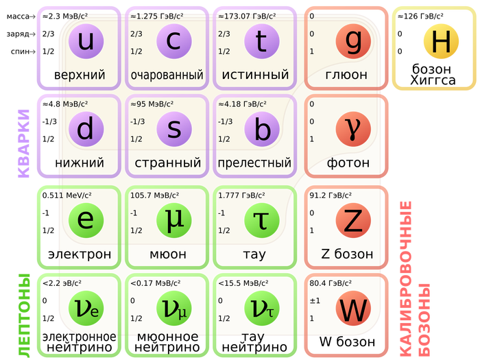 Более того, такие тяжёлые частицы не живут долго, а значит надо ещё и понять по их продуктам распада, что там что-то такое было. Для этого нужно собрать большой набор "подозрительных" событий, которые скорее всего редки. А события, где вся энергия протонов перешла в пару, можно считать вовсе не вероятными. Вот и получается, что мы весьма ограничены в поиске новых тяжёлых частиц. Ясное дело почти все "лёгкие" частицы мы уже довольно давно нашли и построили неплохую модель "всех" элементарных частиц, которую чаще всего называют просто стандартной моделью. Вот вам текущий набор частиц, которые нужны, чтобы описать наблюдаемый мир (почти):