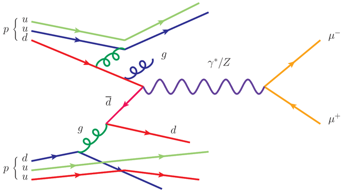 Цветные ровные линии -- фермионы, на данной диаграмме представлены кварками (u, d) и мюоном (антимюоном). Пружинки изображают глюоны, которые являются переносчиками ядерных взаимодействий. Волнистая линия -- виртуальный фотон или Z-бозон, переносчики электромагнитного и слабого взаимодействий соответственно.