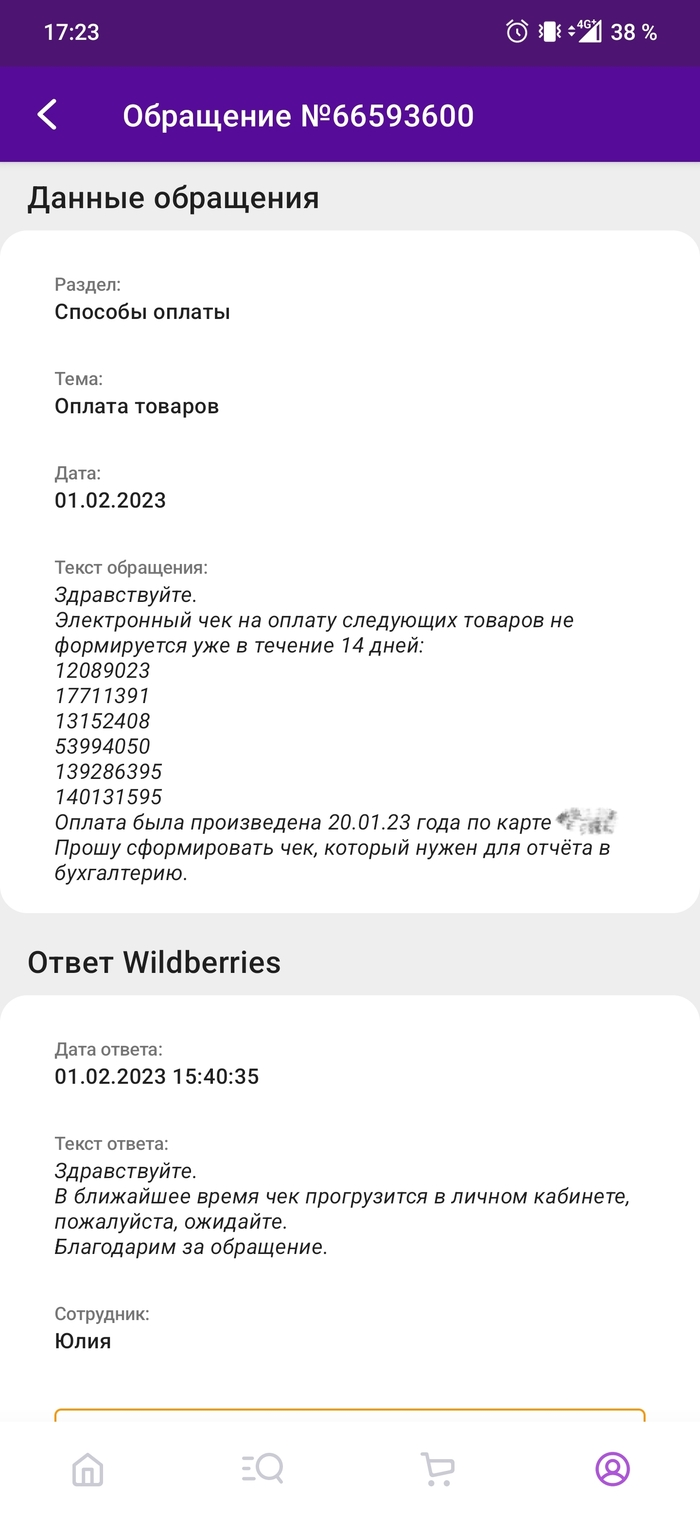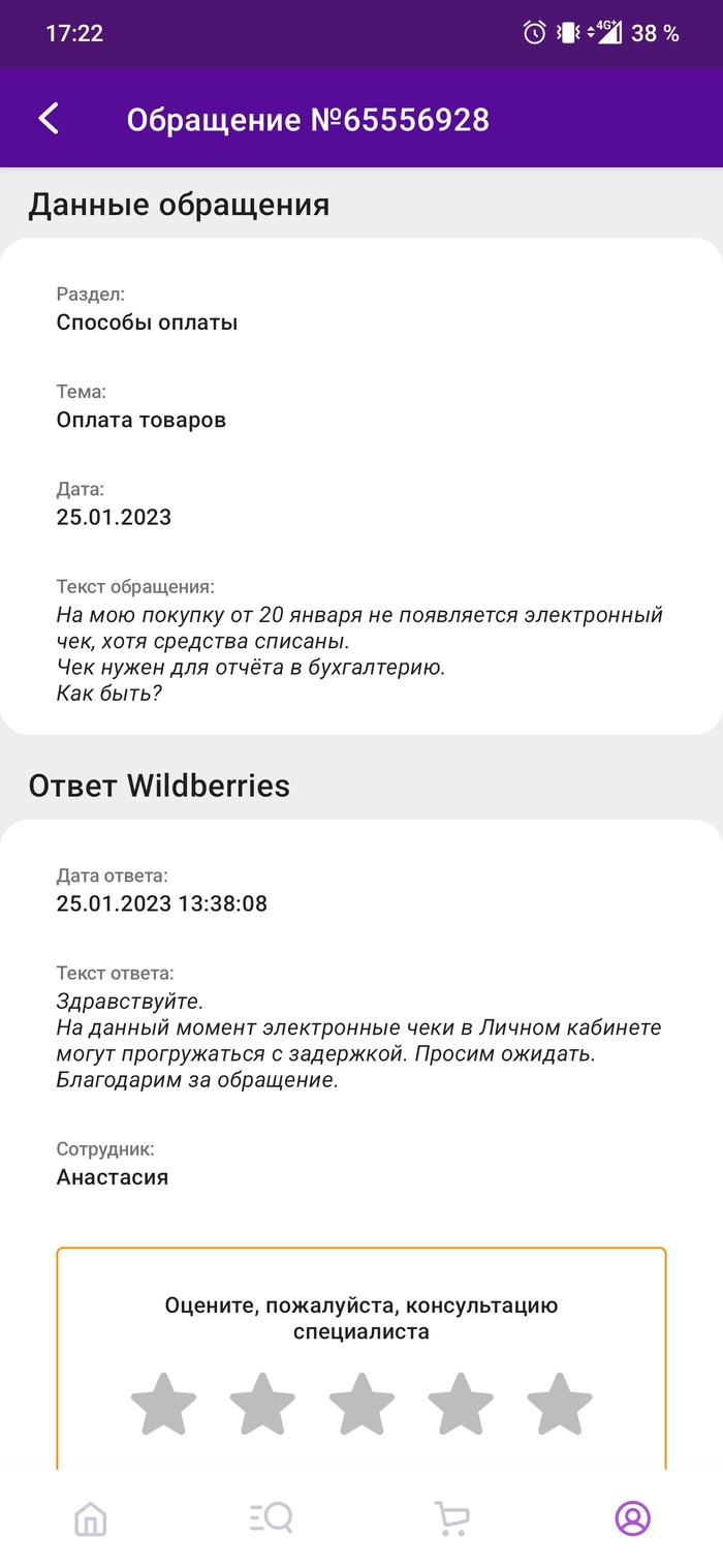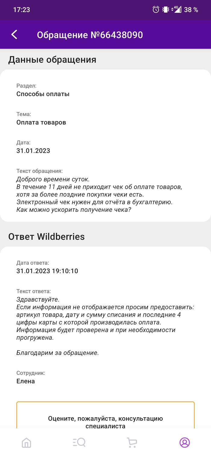 По специфике работы часто заказываю одежду (элементы костюмов для спектаклей, работаю в театре), проблем раньше почти не было (кроме как отсутствие возможности сделать учётную запись организации, как в OZON), а в этот раз произошла проблема с электронным чеком за покупку, который нужен для отчёта в бухгалтерию.