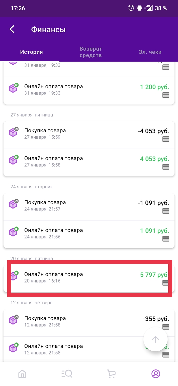 Но на этом скрине видно отличие от остальных покупок, онлайн оплата прошла, а покупка нет, хотя деньги с карты списались.