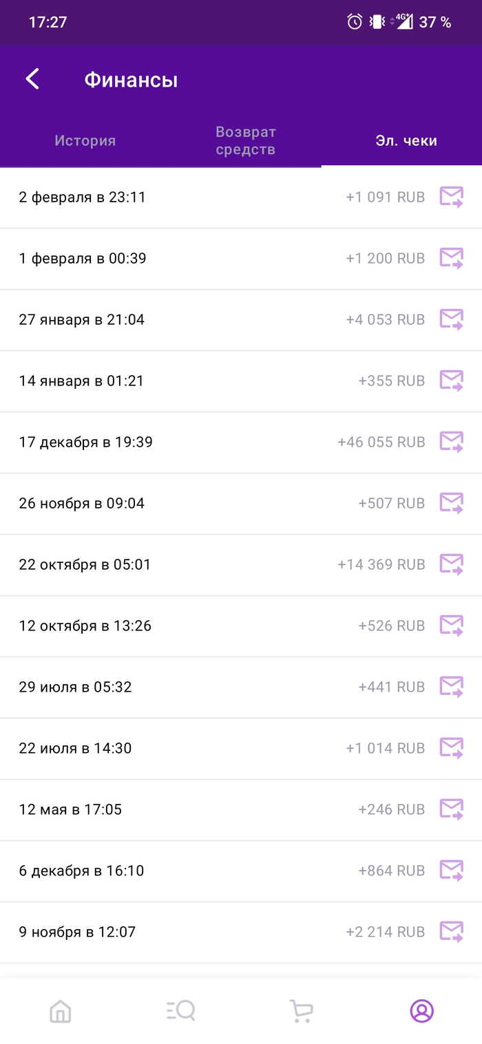 Начал проверять электронный чек для составления авансового отчёта, а чека нет (от 20 января), хотя за предыдущие и последующие покупки чеки появлялись.