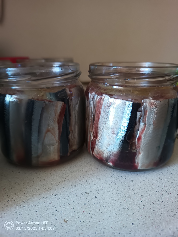 Добавил по 5 г соли, 30 мл подсолнечного масла. Долил воды чтобы рыба была покрыта. Банки закрыл, хорошо потряс.