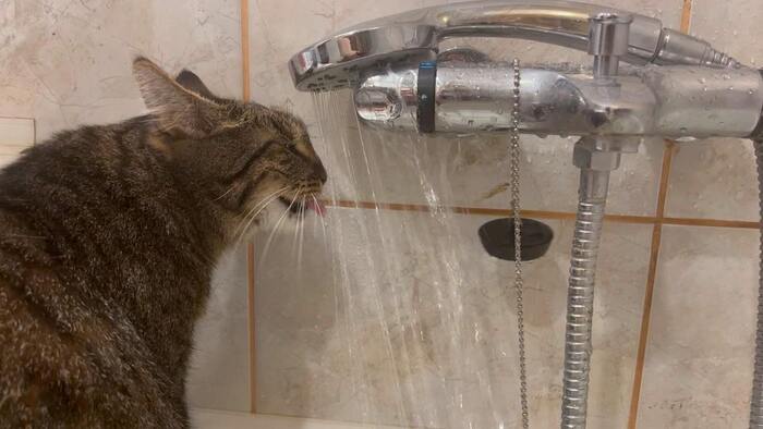 У неё была своя поилка-фонтанчик, в которой всегда свежая вода. Но стоило только зайти в ванную, как приходилось снимать душевую лейку и включать воду. Свежая водичка из душа - что может быть лучше?)
