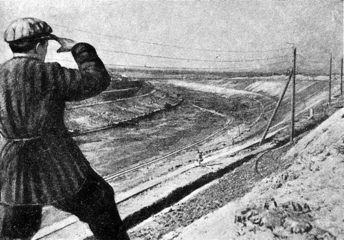 Копать начали в 31м году. К 33му смогли снять и вывезти примерно от двух до четырех метров земли. Только в 33м начали появляться первые экскаваторы. Паровые, на дровах или угле. Передвигавшиеся по специально проложенным полотнам, иногда обрушивающимся и заваливающим ранее выкопанное.