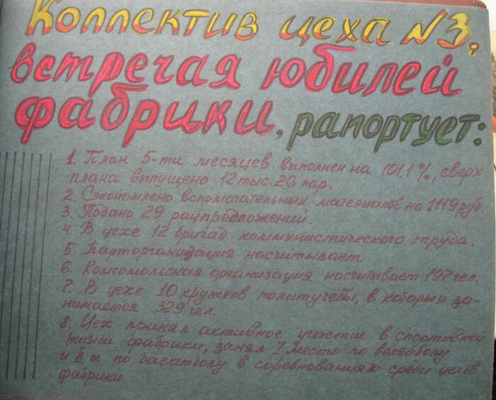 Каждый цех на предприятии создавал свой альбом с отчетом достижений к 50 летию Революции. В данном случае это Летопись комсомольской организации. По качеству оформления он переплюнет "Дембельский альбом"!