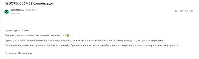 Поэтому всем дочитавшим до конца сообщаю, если вы арендуете автомобиль в этом ахуевшем прекраснейшем сервисе и что-нибудь случится, то будьте готовы сидеть в машине ни смотря ни на что до того момента, пока эта ахуевшая чудесная контора не соизволит решить вашу проблему. И возможно они снизойдут до вас и вам всё же будет положена компенсация, но это не точно.
