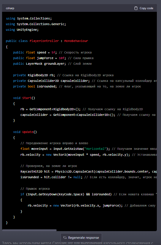 Возвращаемся обратно к ChatGPT и просим написать скрипт для передвижения нашего персонажа, который чуть позже добавим на сцену. Получаем полностью рабочий код из коробки. Следовательно, мы вешаем компонент Rigidbody2D на главного героя, чтобы придать ему физику, а также Capsule Collider2D, чтобы он не проваливался под карту (и не только). После этого мы добавляем наш скрипт. Также добавляем легкую анимацию на персонажа (чтобы придать ему жизнь) и возможность поворачиваться в сторону движения.