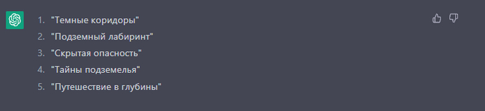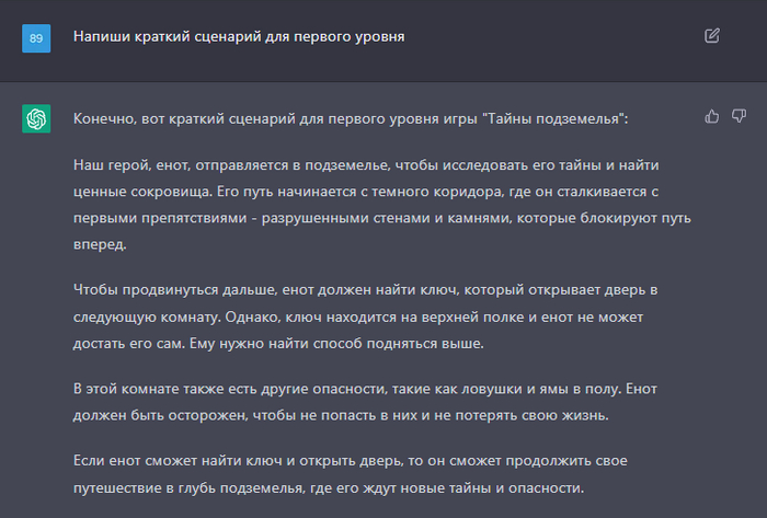 Я начал с простого - обратился к ChatGPT-3 (т.к. нет доступа к 4й версии) с просьбой придумать 5 названий для игры, где главным героем будет обычный енот. После четвёртой генерации названий чат наконец-то вывел нормальные предложения. Я выбрал название под номером 4 - "Тайны подземелья". Следовательно, игра будет про енота, рыскающего по данжам в жанре платформера, возможно с элементами шутера. Чтобы иметь представление о том, что должно получиться, я попросил написать сценарий для первого уровня игры.