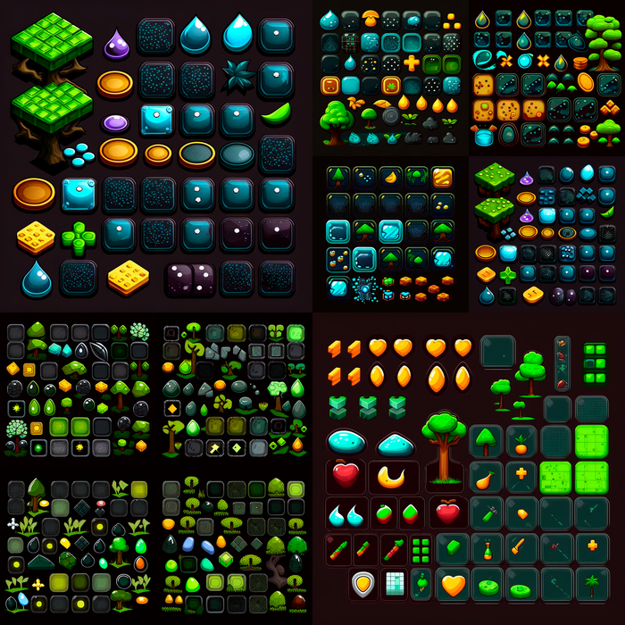Выбрали нужного персонажа, который находится на 10-й картинке, затем сгенерировал спрайты для нашего уровня: камни, траву, ключи и многое другое, что может понадобиться в игре. К сожалению, Midjourney в пробной версии не выводит изображения с хорошим качеством. Поэтому мы переходим к использованию следующей нейросети под названием Topaz Gigapixel AI. Благодаря ей, я увеличил качество и размер нашего изображения до 2K.