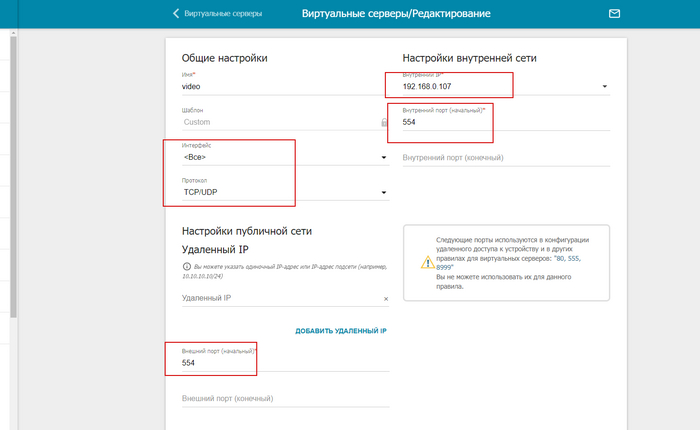 Идем в сетевые службы, смотрим, чтобы rtsp был включен, виден порт, который необходимо "пробросить"