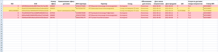 Прикрепляю вырезку из моего отчета. Красным выделены "левые" начисления логистики за заказы, которых не было. Желтым нижняя строка - реальный заказ на новый товар, где он был в одном остатке и его действительно заказали и выкупили, желтым верхняя строка - повторное начисление логистики за этот же заказ.