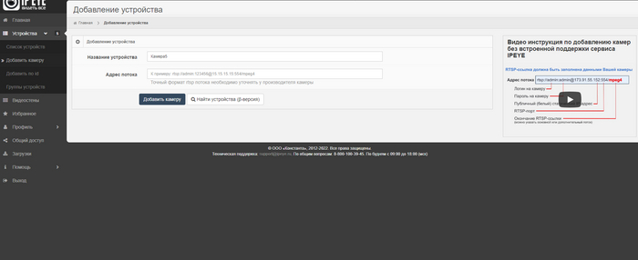 Идем дальше. Регистрируемся на ipeye.ru, платный тариф не нужен, у нас в ресивере уже есть жесткий диск. Жмем добавить камеру, необходимо узнать адрес потока, это как раз и есть rtsp ссылка.