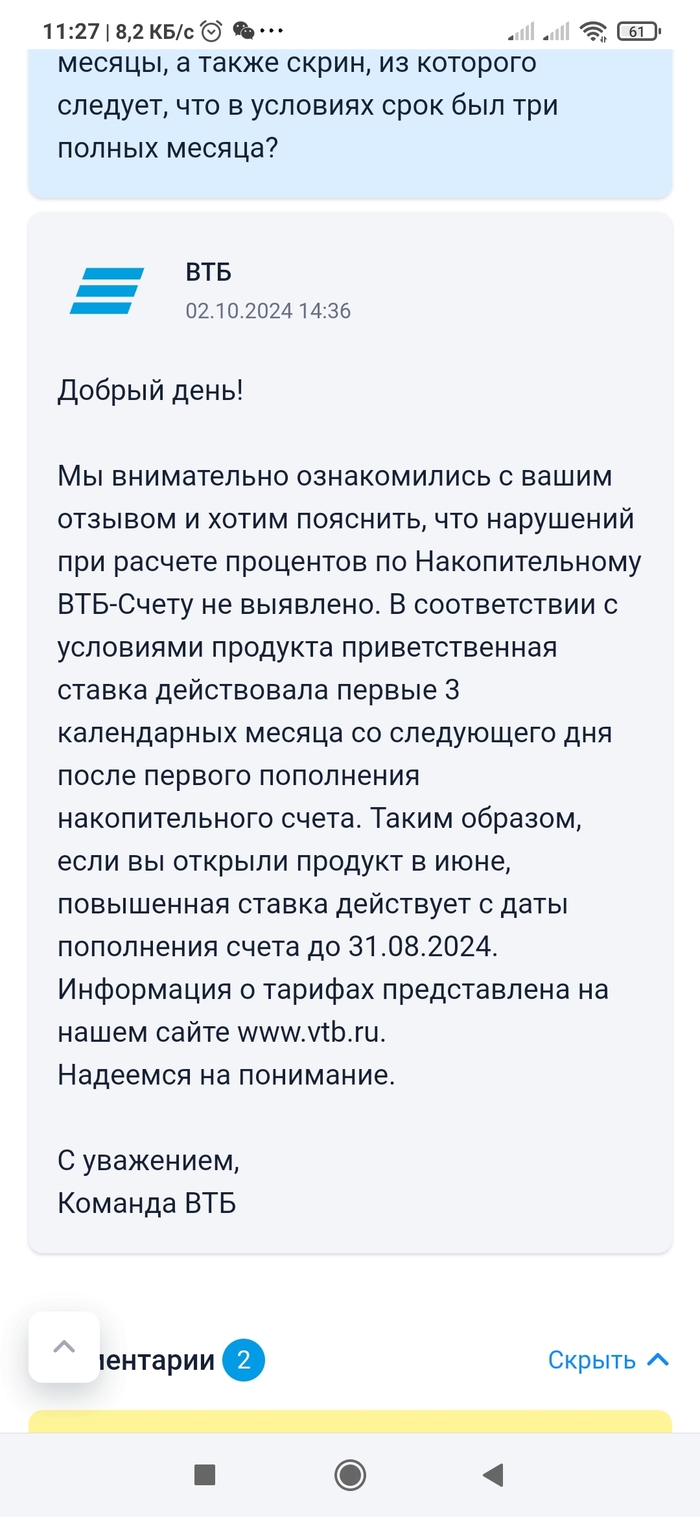 За первые два месяца получил норм, но за третий почти в 2 раза меньше. На вопрос почему, ответили, что имелось ввиду календарные месяцы, т. е. 2 полных и несколько дней. На вопрос, где это написано не смогли ответить 3 сотрудника по телефону. Написал отзыв в Irecommend. Пришло письмо о том, что отзыв опубликован (после модерации). Потом спустя время - что снят (якобы за оскорбления). Смягчил в заголовке "нечистоплотная" на "ненадёжная", теперь придрались якобы к запятым.