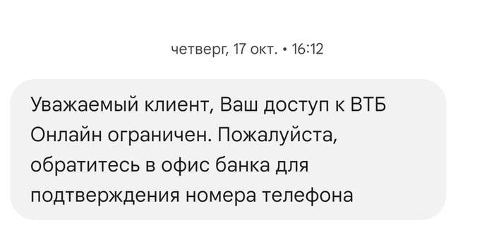 Естественно звоню в банк, на что мне радостно отвечают, что надо подойти в любое ближайшее отделение подтвердить номер. Моё сообщение, о том, что был там недавно, подтверждал - проигнорировали. На вопрос "почему к ним надо ходить как на работу" - грустно вздохнули.