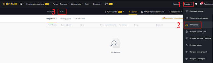 Заходим в ордера (1), Р2Р ордер (2), выбираем Р2Р (3).