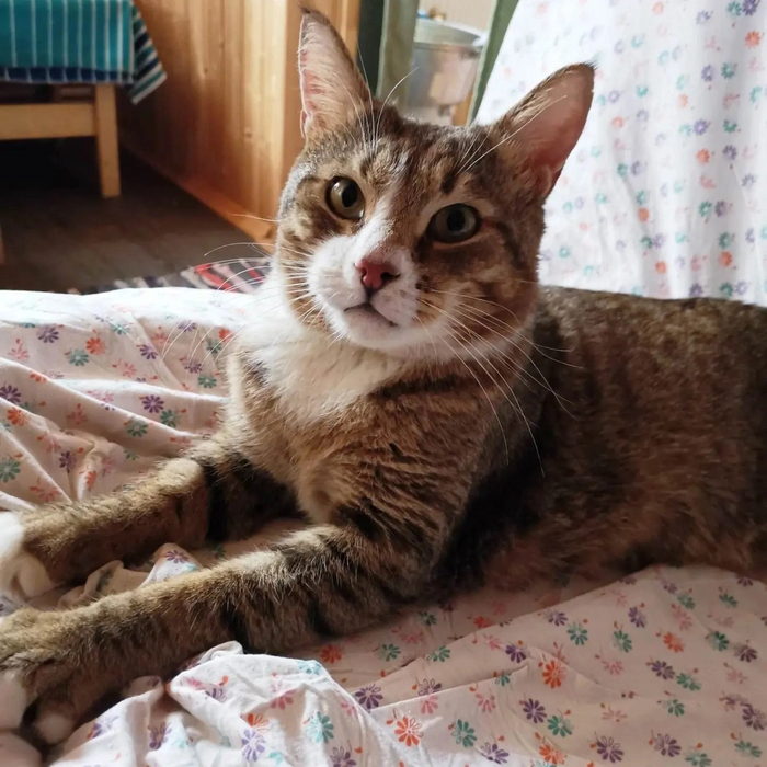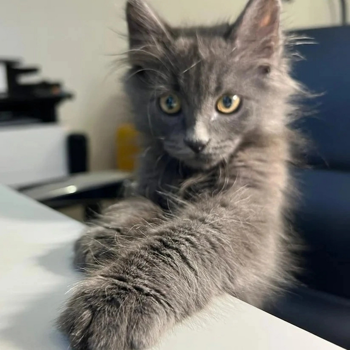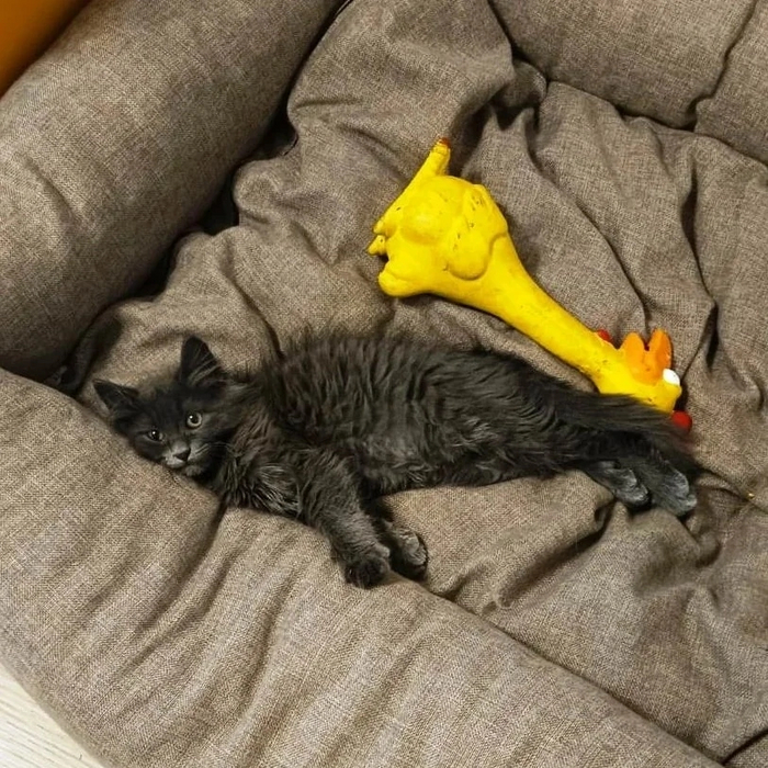На улице получил травму лапки, был у хирурга, переломов нет, нужно время для окончательно заживления (котенок уже даже почти не хромает, но все же нужно следить, чтобы не прыгал с верхотулей, пока лапка не зажила).