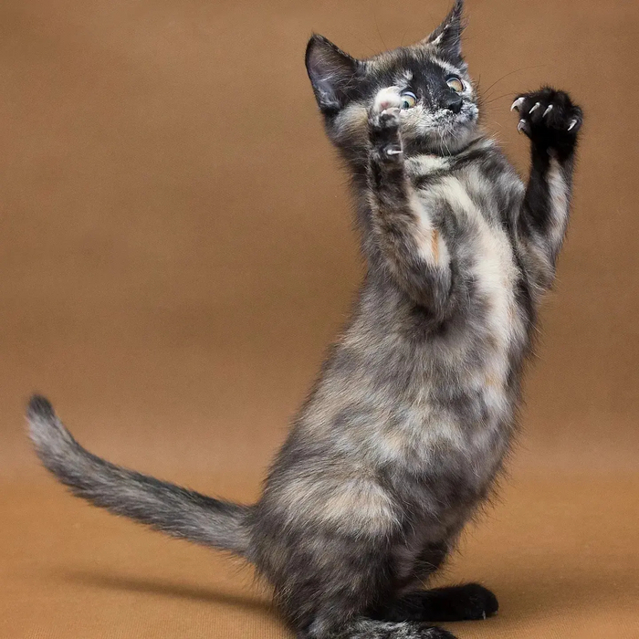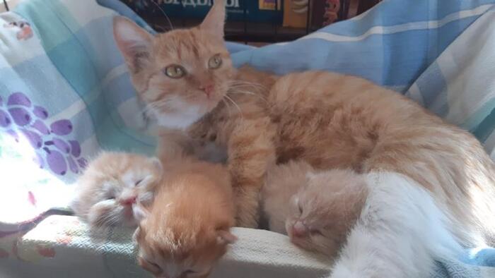 Кошечка окотилась на рынке 3 месяца назад. Семейство неудачно расположилось на бетоне за стеллажом, откуда их хотели прогнать палкой. Котятам на тот момент было 2 дня отроду..