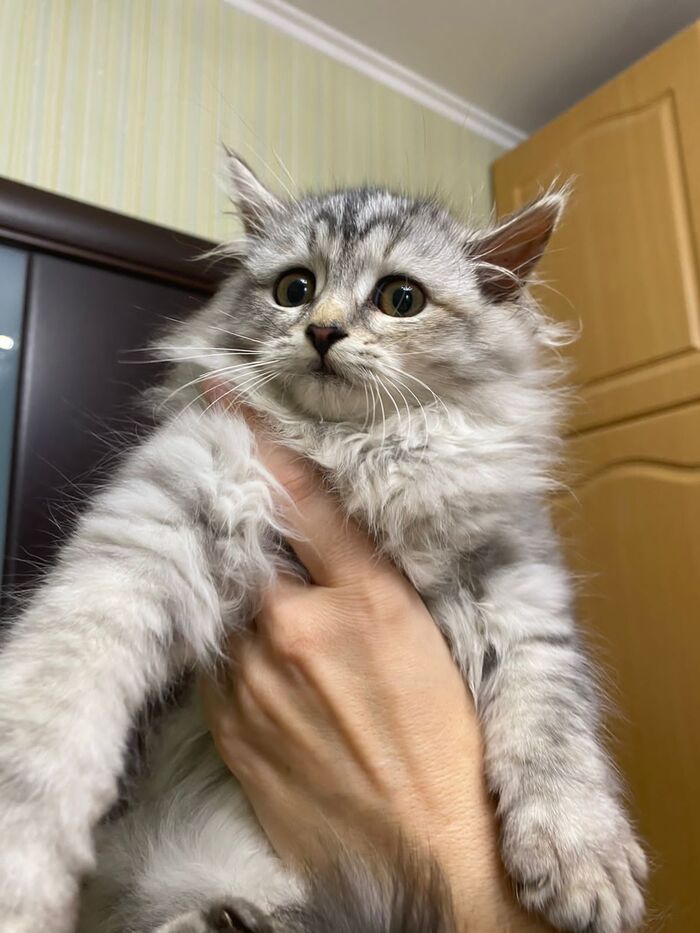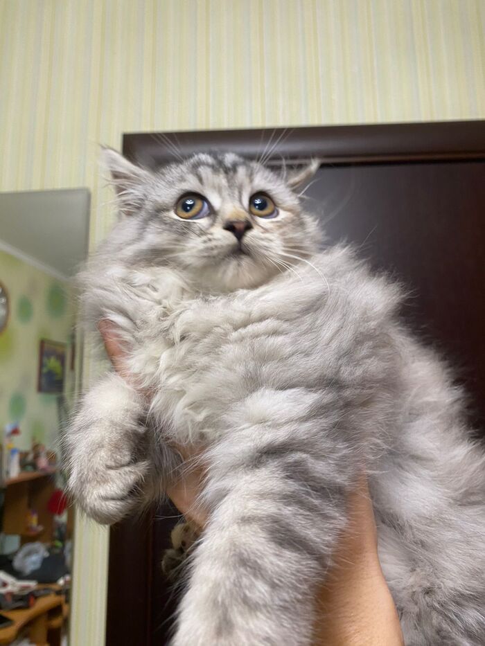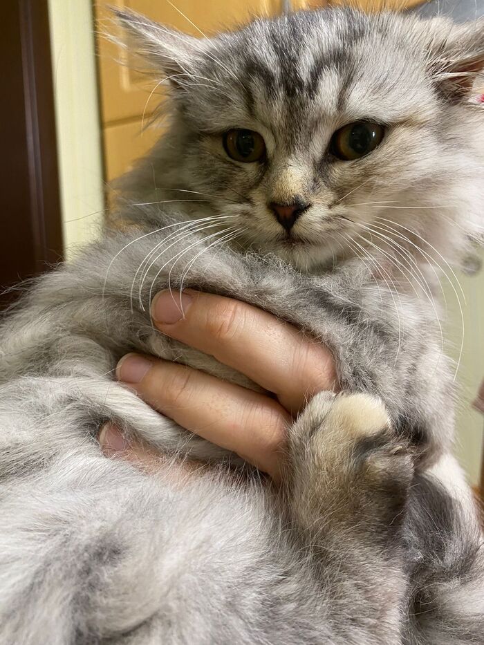 Котика назвали Пломбир. Он очень ласковый и контактный - сам пошел в руки, до дома кормилица донесла его на руках, даже без переноски. Пломбир оказался явно бывшедомашним - сразу пошел в лоточек, понял, где мисочки с едой. А от любви и ласки Пломбир растекается и млеет. За что же его выкинули?