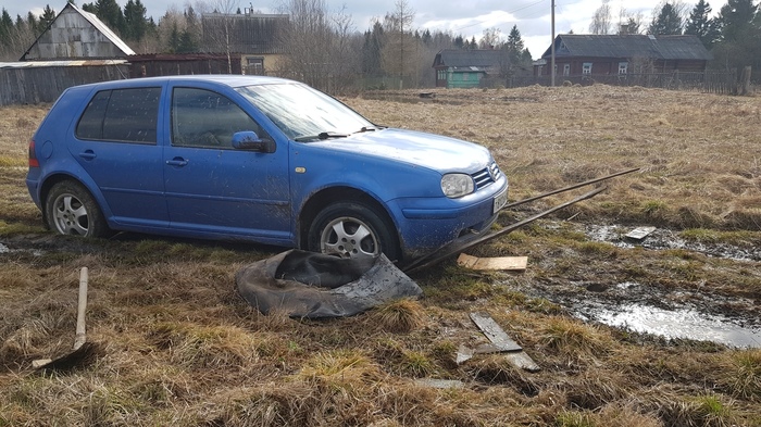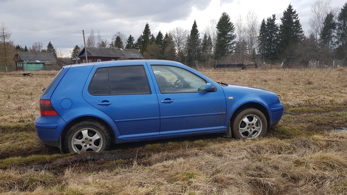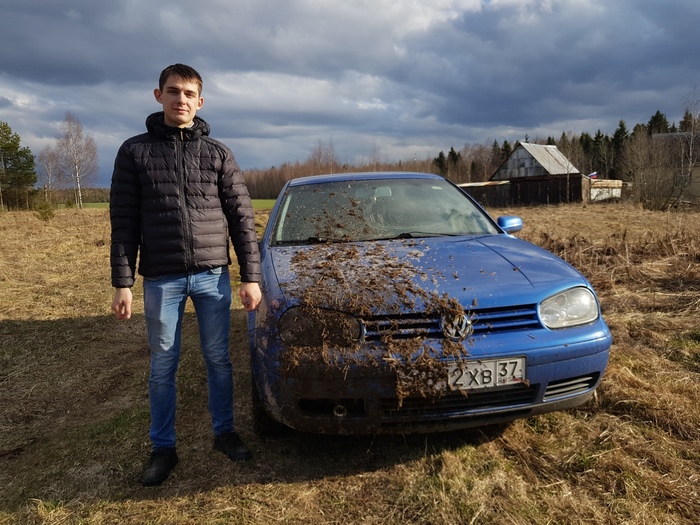 Подъезжая к деревне и видя Победы, а заодно и грязь через которую надо будет ехать, у меня возникла мысль, что Гольфа надо оставить здесь, а самим дойти пешком (хотя как позже мы узнали, рядом есть нормальная, сухая дорога), но мысль что надо сфотографировать Гольфа с Победами, ведь неизвестно когда мы еще сюда поедем опередила и без доли сомнения, я полез через лужу.