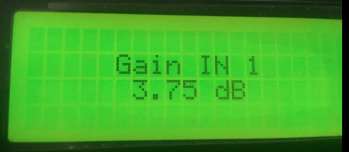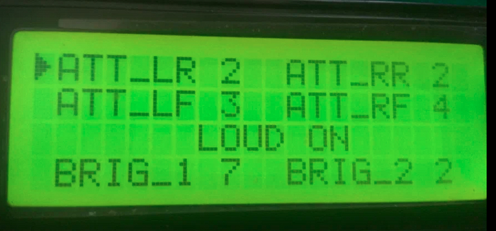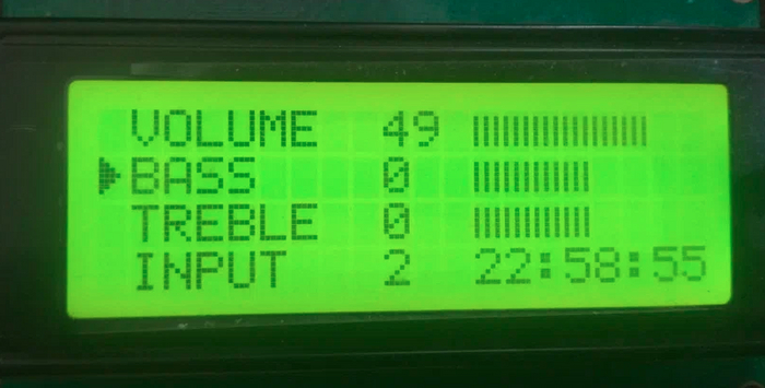 В основное меню собраны основные параметры такие как громкость, тембр (ВЧ, СЧ, НЧ), выбор входа и регулировка предусилителя входа (независимый для каждого входа). Выбор параметра осуществляется при помощи кнопки энкодера, а изменение параметра при помощи поворота ручки энкодера, дополнительно для управления аудиопроцессором используются кнопки выбора входа, активация режима MUTE и переключения с основного меню на вспомогательное (и наоборот). В основном меню так же все параметры можно изменить при помощи ИК пульта.