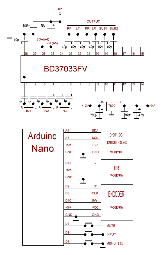 Аудиопроцессор BD37033FV имеет несколько входов и выходов, в данном случае будет использовано только три стерео входа и шесть выходов (ПК ЛК фронт, ПК ЛК тыл, два выхода сабвуфера).