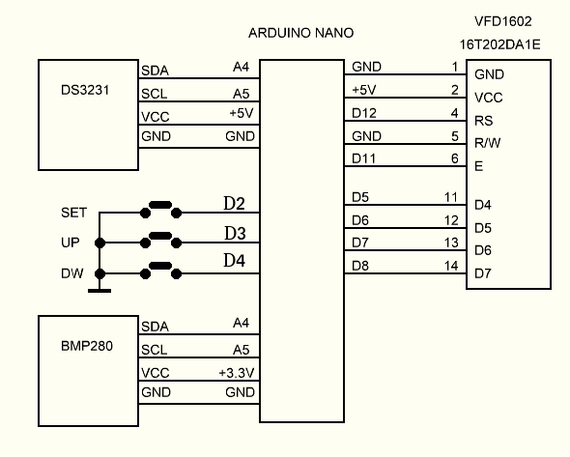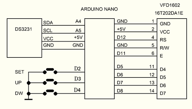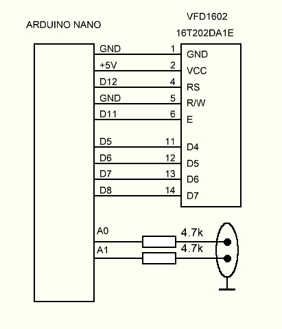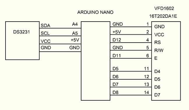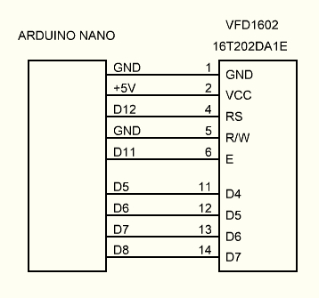 Для правильной работы базе вакуумно-люминесцентного индикатора требуется два источника питания, это питание сеток и анодов напряжением 12-27 В и питание катода (нити накала) переменным напряжением от 1,2 до 5 В (в зависимости от типа ВЛИ). В дисплее 16T202DA1E все необходимые источники для правильной работы ВЛИ уже встроены в плату, поэтому для питания дисплея Вам понадобится только одно напряжение в 5 В. Так же в отличии от LCD1602 в дисплее 16T202DA1E нет вывода Vo (регулировка контрастности), что делает подключение дисплея к Arduino Nano еще проще.