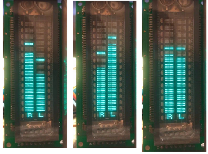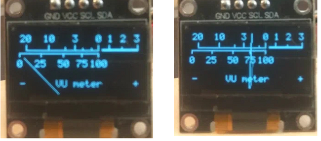 На рисунке показана схема простого индикатора уровня звукового сигнала (VU meter) имитирующего работу стрелочного индикатора. На входы А0 подается звуковой сигнал через резисторы номиналом 4,7 кОм. Индикатор уровня имеет 90 ступеней, содержит шкалу в дБ и %.