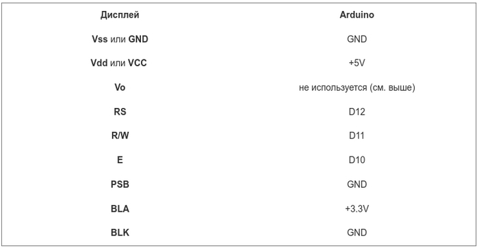 Основное напряжение питания +5 В, дополнительное 3,3 В используется для подсветки дисплея. Рассматриваемый в статье дисплей на плате имеет регулятор контрастности, но может поставляться и без него, тогда на вход Vo подается напряжение с потенциометра (см. схему).