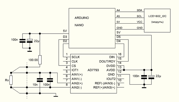 Для упрощения конструкции прибора напряжение на эталонное сопротивление 100 Ом подается от источника питания +5 В Arduino, которое также является аналоговым напряжением питания АЦП AD7793, а так как в АЦП имеется возможность контроля этого напряжения, то оно становится опорным, так как перед каждым замером сопротивления производится измерения аналогового напряжения питания АЦП которое также подается на эталонное сопротивление.