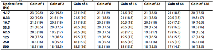 Разрешение в зависимости от множителя входного усилителя (bit) и режима работы входа (Uref = 2.5 V)