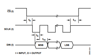 Управление АЦП 4-проводное SPI, используются пины CS, DOUT, DIN, SCLK. Режим работы шины SPI показаны на рисунках (чтение/запись)