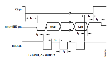При чтении после перевода сигнала разрешения работы CS в низкий уровень необходимо дождаться сигнала готовности АЦП, как только уровень DOUT/RDY станет низким, можно считывать данные. Считывание бита происходит на восходящем фронте синхроимпульса.