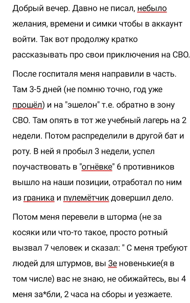 Это начало истории, попросили написать, напишу как умею. Про мотивы. Ну во первых я достаточно патриотичный человек и меня прям бесило что Россию с 2014 постоянно где-то с говном мешают. Во вторых я люблю историю читать, изучать а тут историческое событие! И что его пропустит?!!! Потом внукам буду рассказывать как воевал. В третьих бабки с*ка бабки... Дожил до 30 лет вроде работал а за душой ничего нет. За 2 года денег на дом заработаю, буду в покое жить. В четвëртых проверить себя. Одно дело на байдарке плавать или в горы лазать а тут война, она суть людей обнажает. В пятых Гитлер воевал! Я чë трусливее Гитлера?! 😁 Ты представляешь как трудно жить зная что Гитлер не зассал пойти на войну а ты очкуешь... 😁 Ну и жены нет, детей нет. Грустить об мне будет только мать и брат. Друзья и близкие забудут через год два, так всегда бывает. В общем ничего меня дома не держало. Так тут надо упомянуть, что мне 34 года образование высшее, работал в отделке, з. п. нормальная для моего региона. Курю. Отношение к алкоголю положительное(пятница и суббота) по будням ни ни. И вот я в трезвом состоянии и полностью себя осознавая пошëл в военкомат с целью записатся на СВО. Продолжение позже.