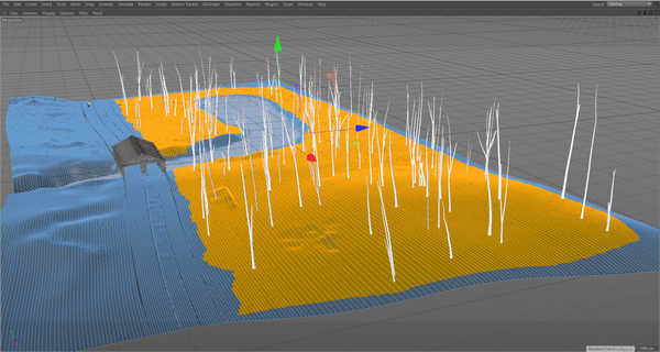 Выделяю области, на которых должны расти деревья, кидаю инстансы в Mograph Cloner, настраиваю и готово :) Под каждый тип деревьев свое выделение и свой Cloner. Модификатором Random настраиваю вариацию поворота на 360 градусов, чтобы дубликаты сильно не палились.