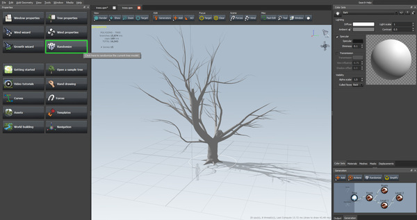 После настройки нужного типа дерева, кнопкой "Randomize" можно генерировать разные типы и формы, по ранее заданным параметрам.