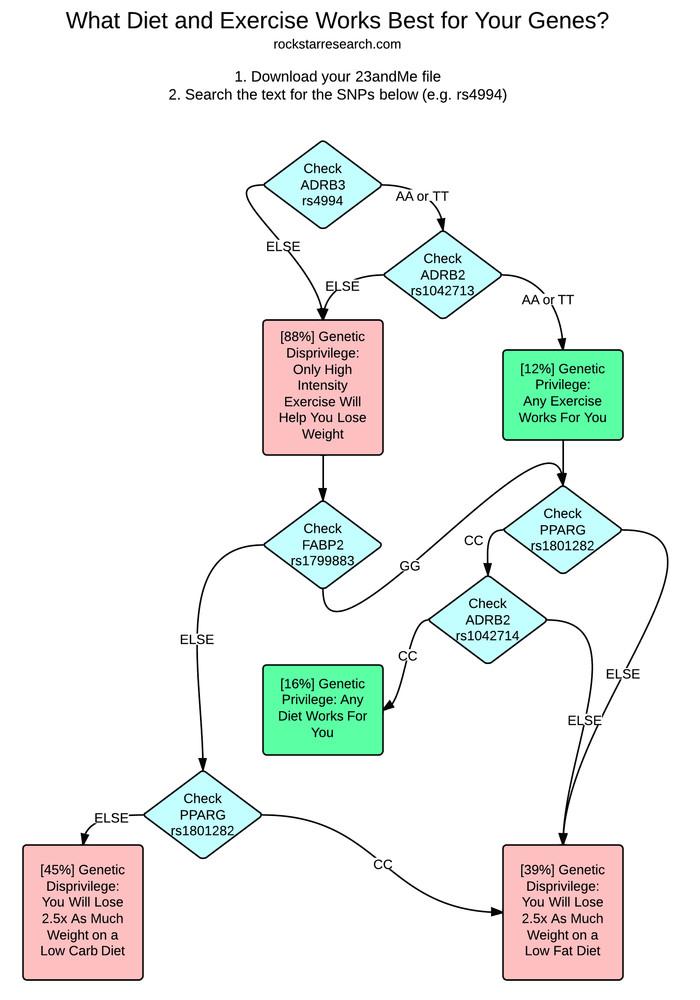 В отчете можно обнаружить какие-то базовые вещи - вроде цвета кожи и глаз, так и предрасположенности к заболеваниям типа рака или диабета. Также есть и совсем интересные вещи типа гена чувствительности к кислому вкусу, которая нормализуется с возрастом или, что стало для меня неожиданностью - вариант сочетания 5 генов, при котором достигается в 2,5 раза более эффективный сброс веса с помощью диеты с низким содержанием жиров (а не углеводов, как рекомендуют практически все фитнес-тренеры).