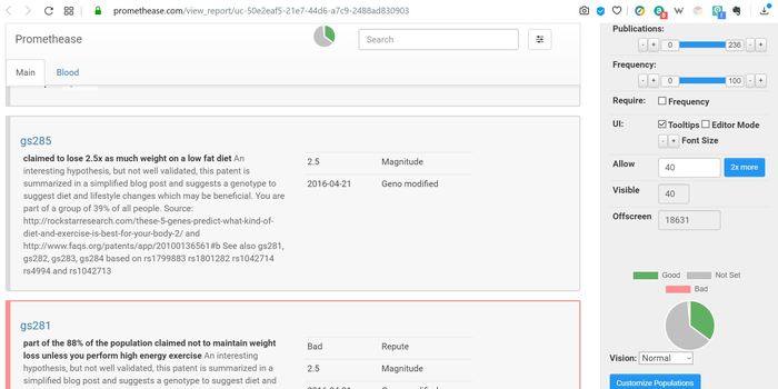 Но все это меркнет по сравнению с тем, какую бездну информации по вашему ДНК (у меня около 20 тыс записей) выдает сайт https://promethease.com, где в формате удобного кастомизируемого отчета можно увидеть описания различных генов и их вариантов как с сайта https://www.snpedia.com, так и открытые данные из базы 23andme.